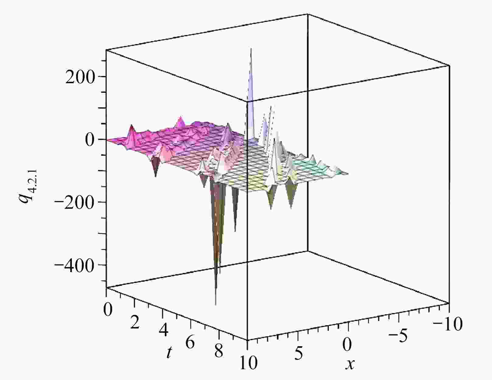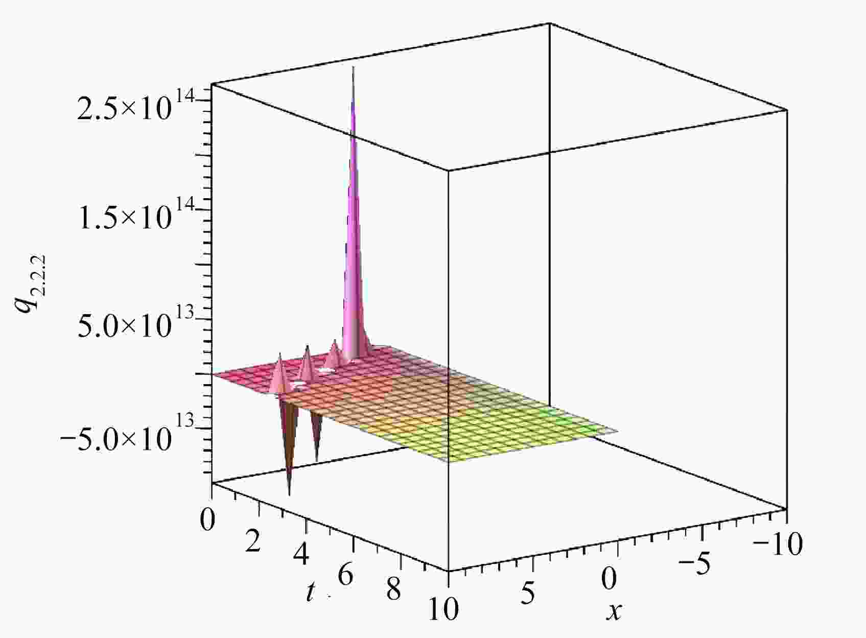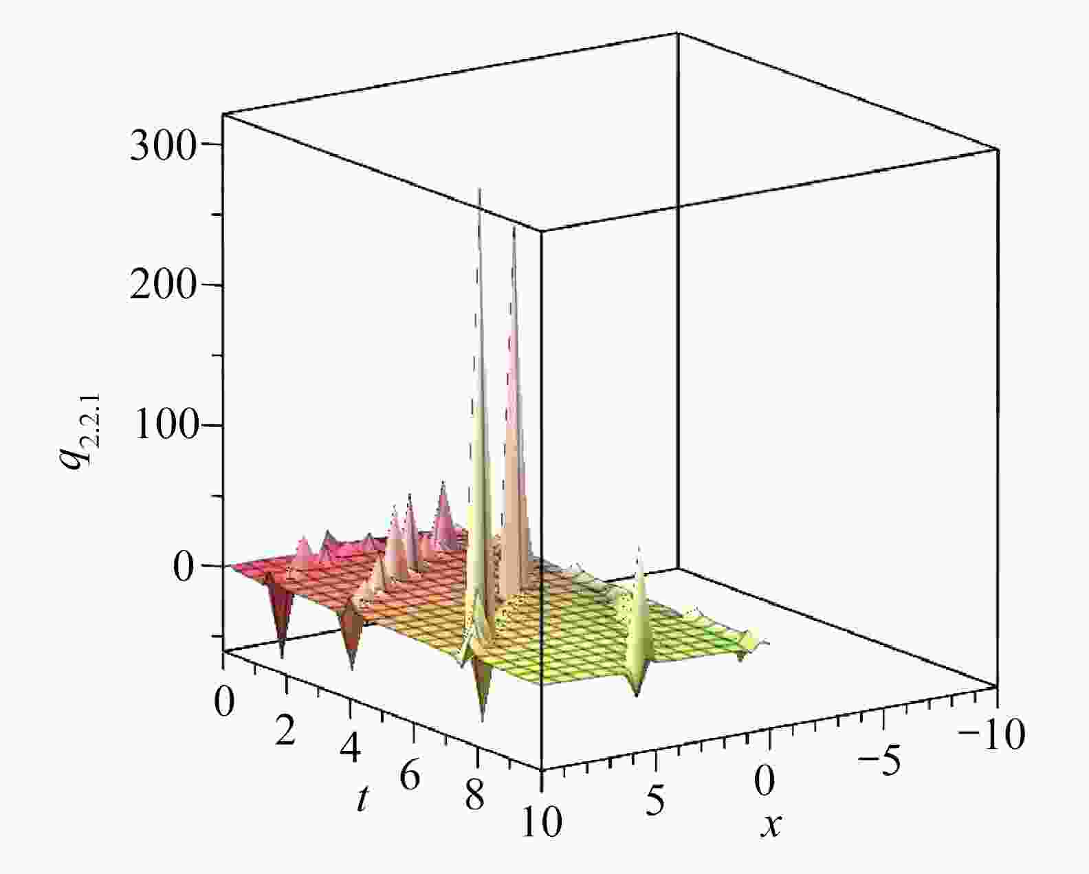 $\lambda = 2,\;\mu = 2,\;K = 1,\;v = 1,\;\beta = - 1,\; c = 1,\;s =-5,\;\alpha = {1}/{2}$ 时,$ {q_{2.2.1}} $ 的图像Figure 2. The graphic corresponding to