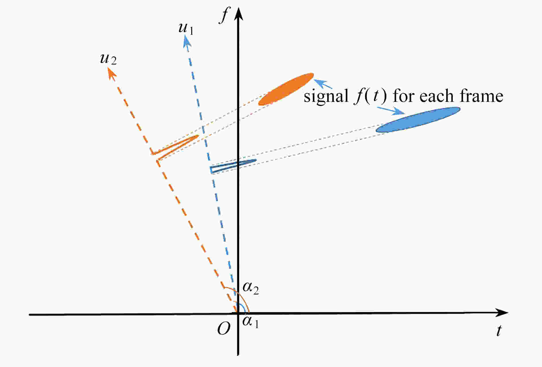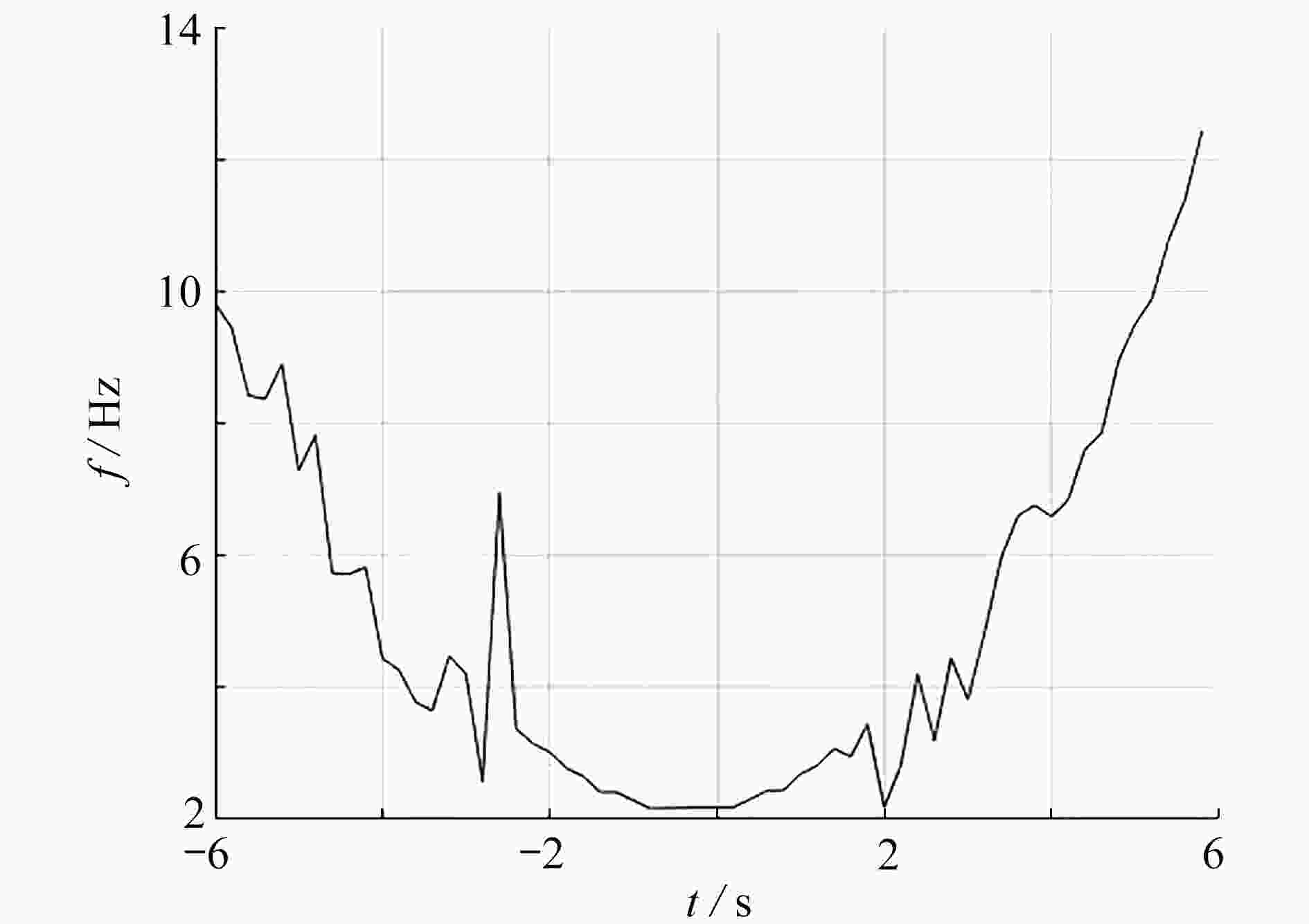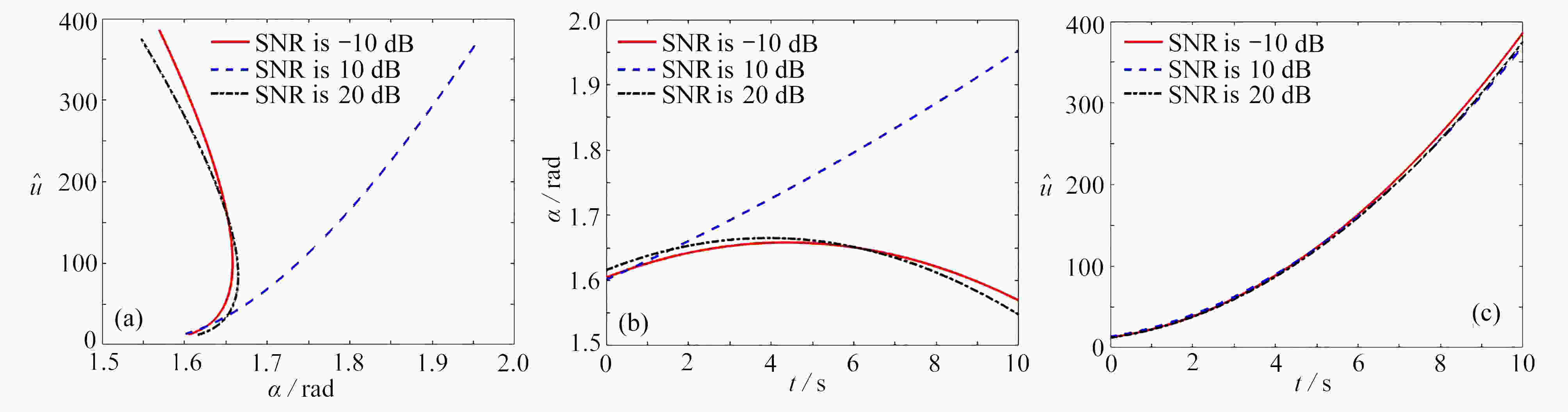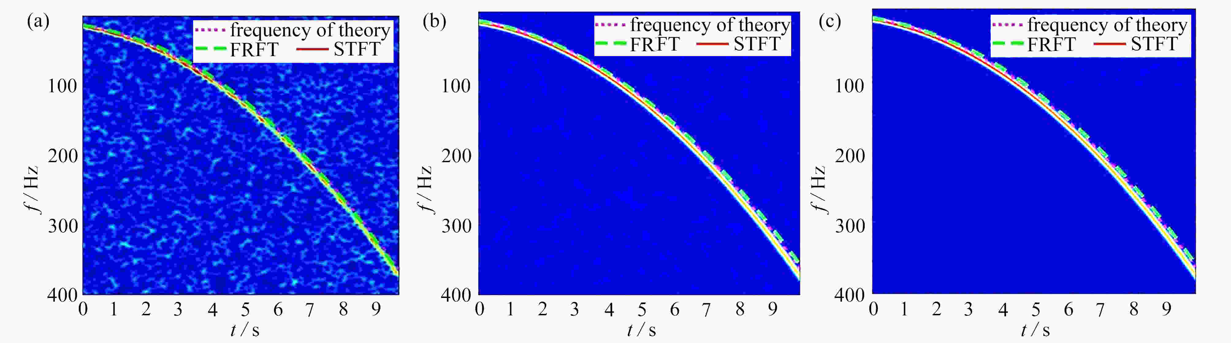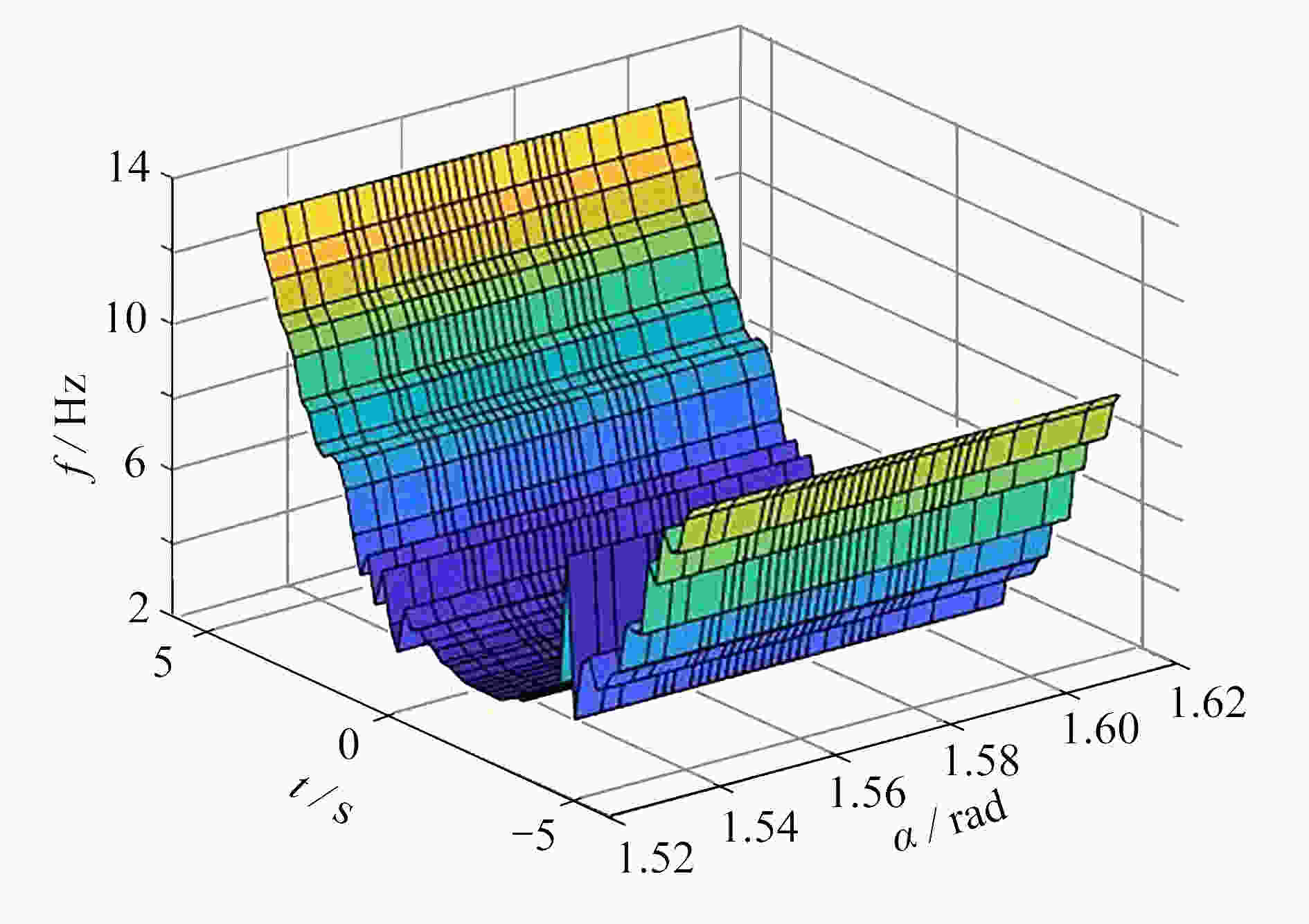 $\hat{u} $ 关系曲线;(b) 时间与α关系曲线;(c) 时间与最佳$\hat{u} $ 关系曲线Figure 6. The FRFT identification process of signal instantaneous frequencies: (a) the relationship curve between α and