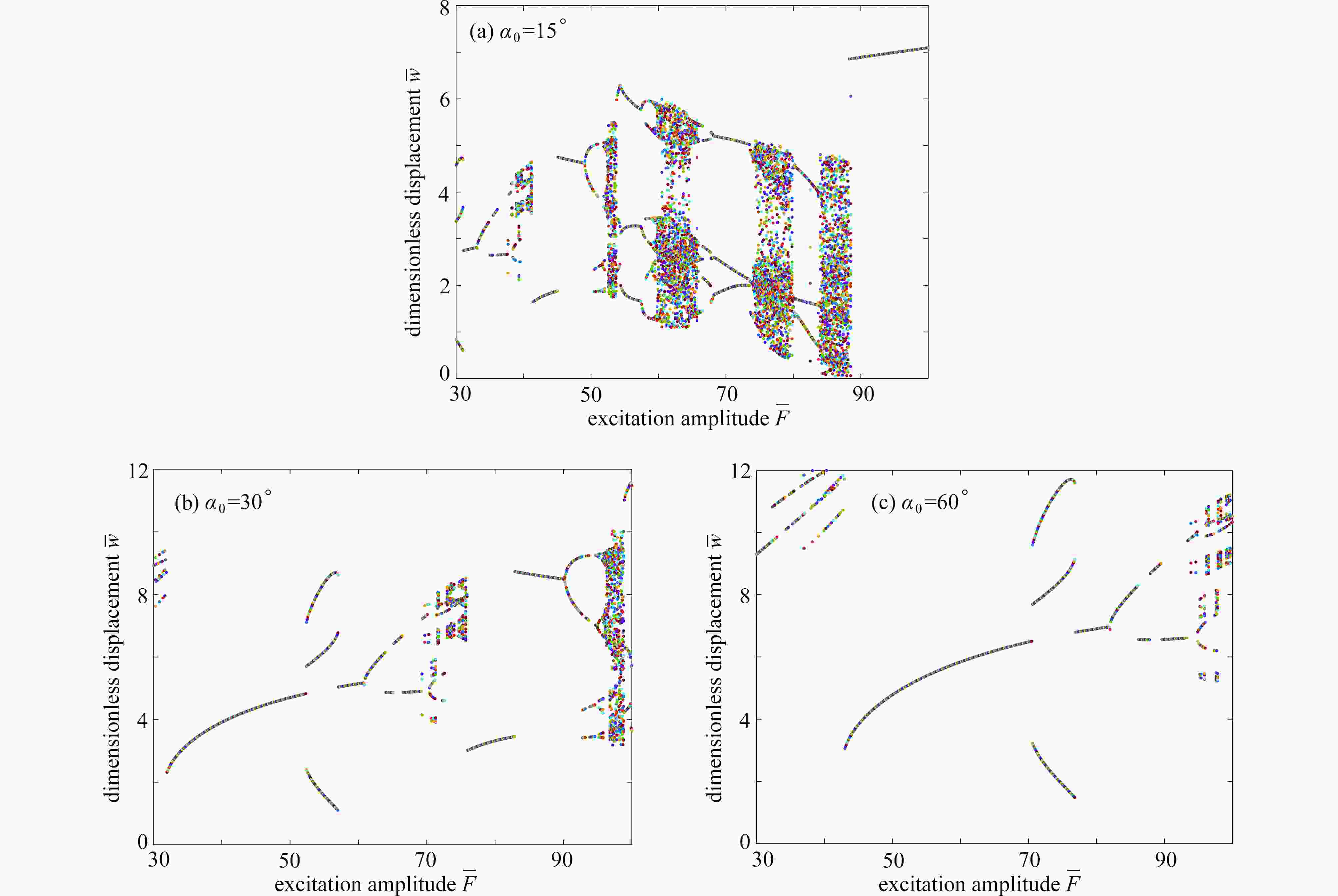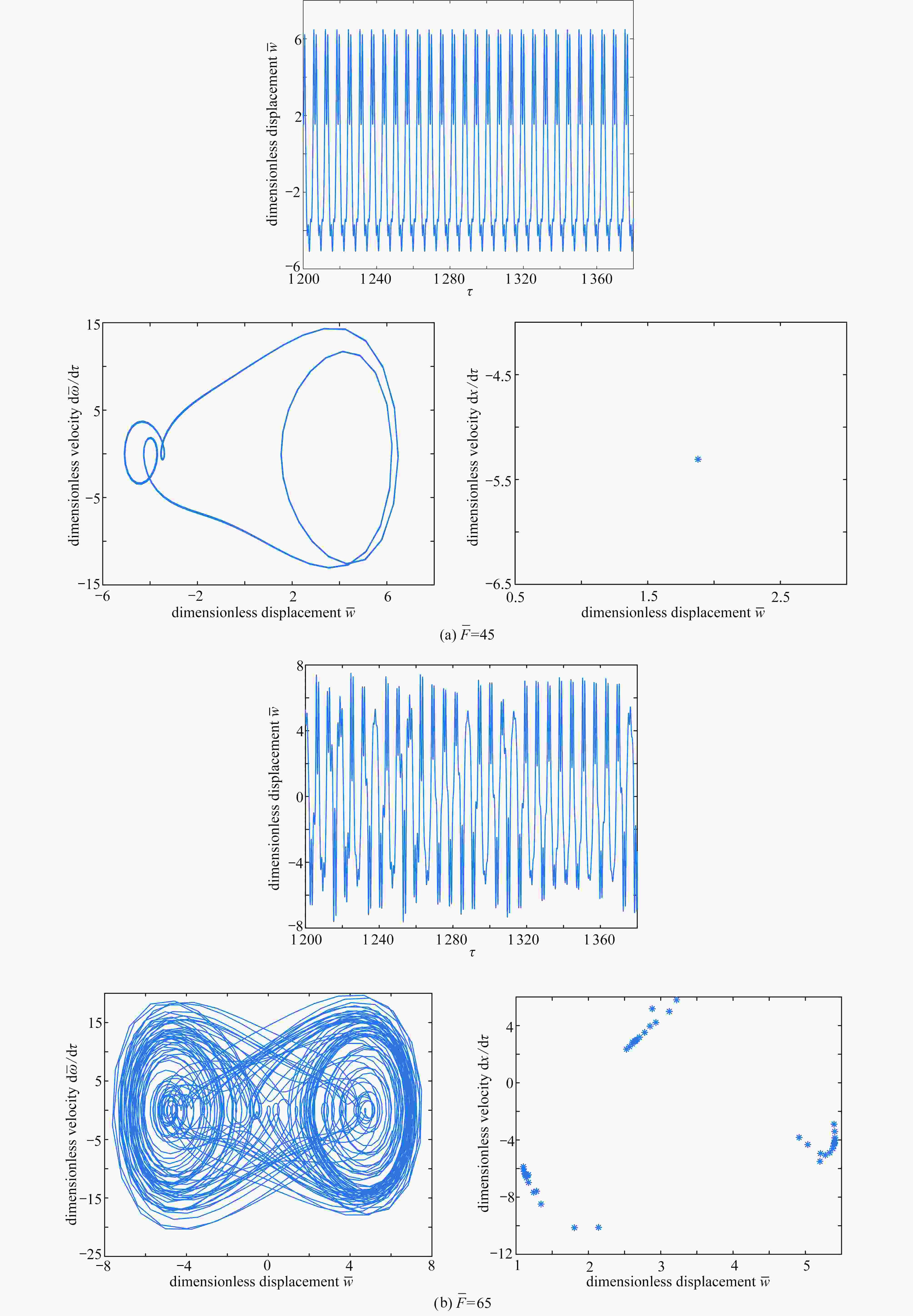 Abstract:The nonlinear vibration responses of functionally graded materials (FGMs) shells with different cone angles under external loads were studied. Firstly, the Voigt model was employed to describe the physical properties along the thickness direction of FGMs conical shells. Then, the motion equations were derived based on the 1st-order shear deformation theory, the von Kármán geometric nonlinearity and Hamilton’s principle. Next, the Galerkin method was applied to discretize the motion equations and the governing equations were simplified into a 1DOF nonlinear vibration differential equation under Volmir’s assumption. Finally, the nonlinear motion equations were solved with the harmonic balance method and the Runge-Kutta method, and the amplitude frequency response characteristic curves of the FGMs conical shells were obtained. The effects of different material distribution functions and different ceramic volume fraction exponents on the amplitude frequency response curves of conical shells were discussed. The bifurcation diagrams of conical shells with different cone angles, as well as time process diagrams and phase diagrams for different excitation amplitudes, were described. The motion characteristics were characterized by Poincaré maps. The results show that, the FGMs conical shells present the nonlinear characteristics of hardening springs. The chaotic motions of the FGMs conical shells are restrained and not prone to motion instability with the increase of the cone angle. The FGMs conical shell present a process from the periodic motion to the multi-periodic motion and then to chaos with the increase of the excitation amplitude.