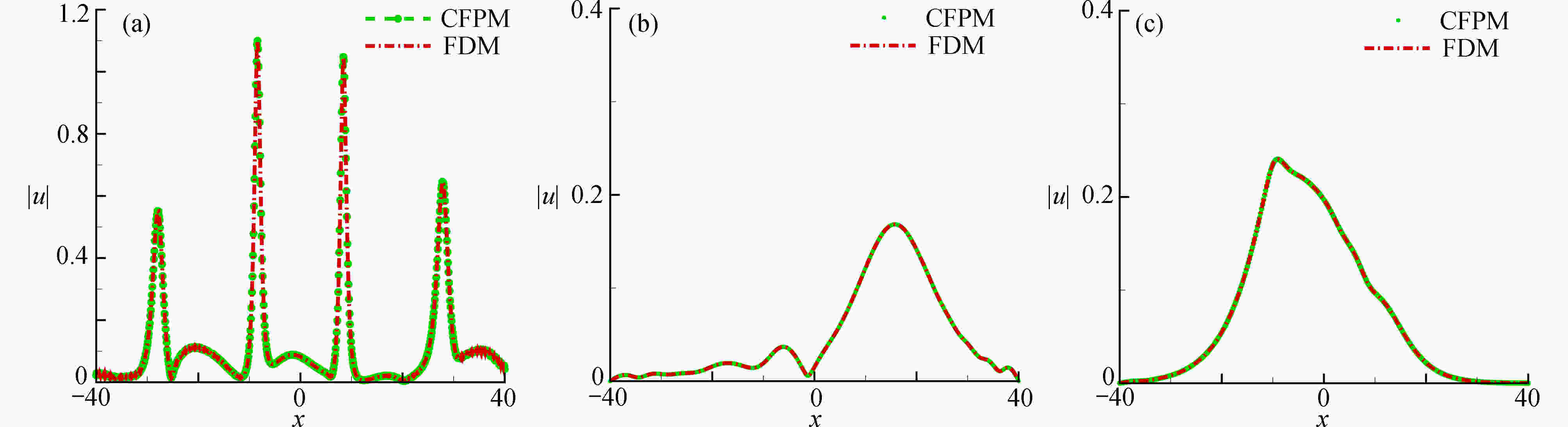 图  6  CFPM对孤立波函数|u2|的数值结果:(a) α=1.0; (b) α=0.9; (c) α=0.7