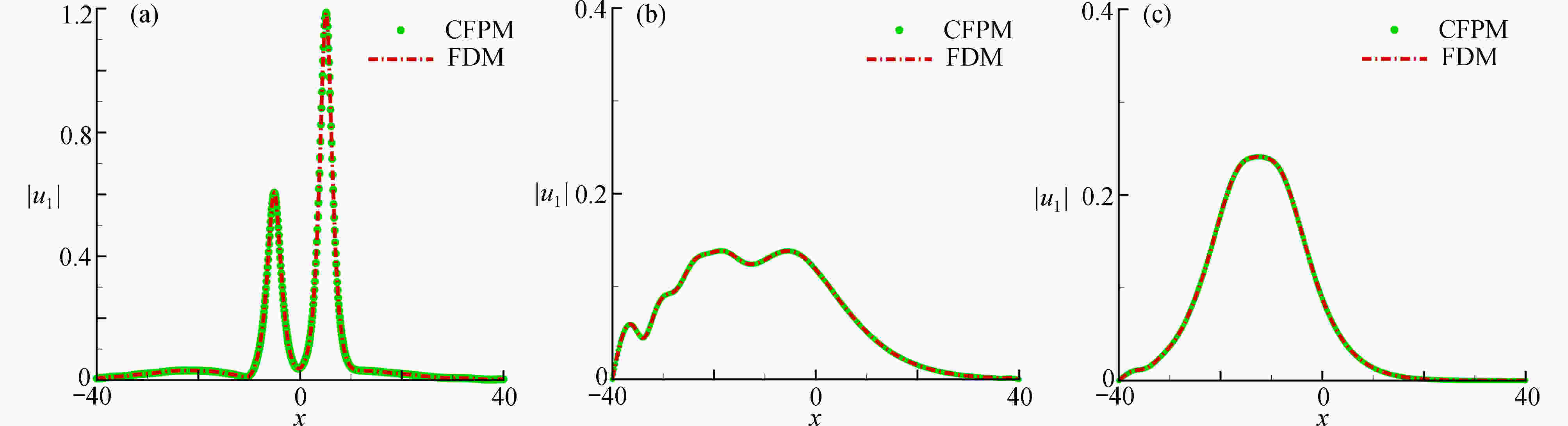 图  5  CFPM对孤立波函数|u1|的数值结果:(a) α=1.0; (b) α=0.9; (c) α=0.7