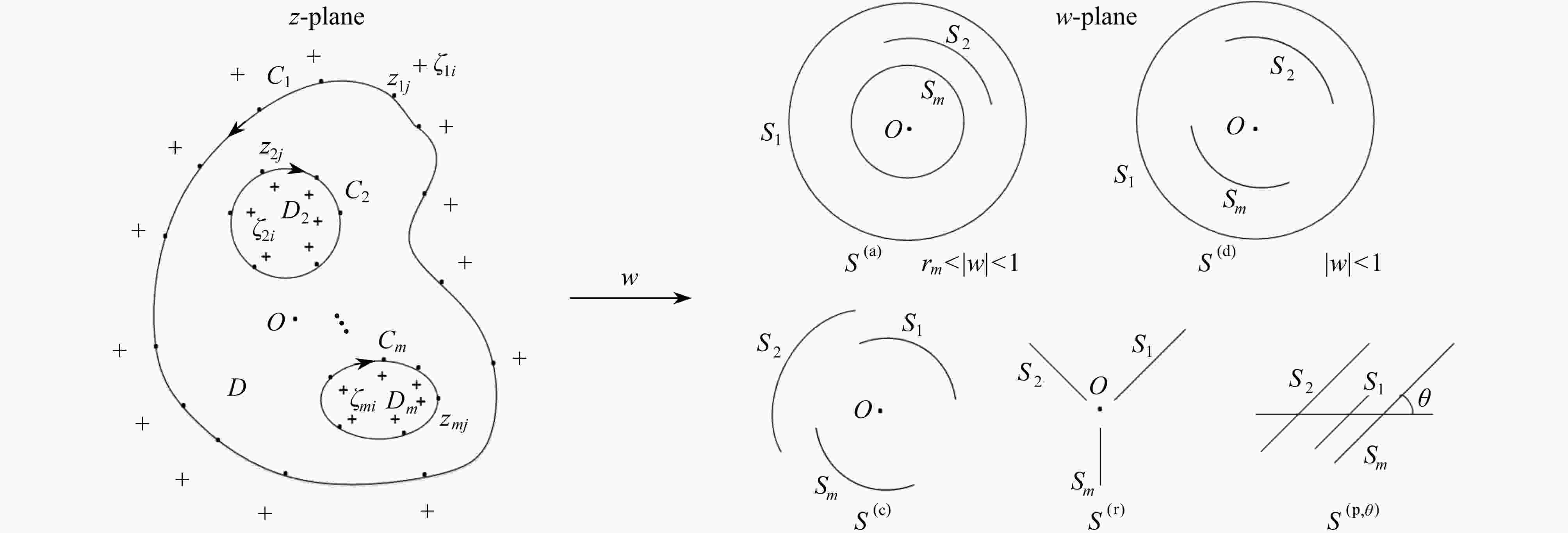 • 图  1  基于模拟电荷法的有界多连通区域保角变换(“·”代表约束点, “+” 代表模拟电荷点)