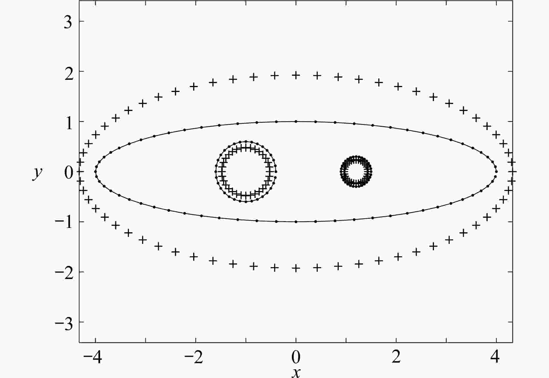 Figure  1.  The conformal mapping of bounded multi-connected regions based on the charge simulation method (“·” represents collocation points, “+” represents charge points)