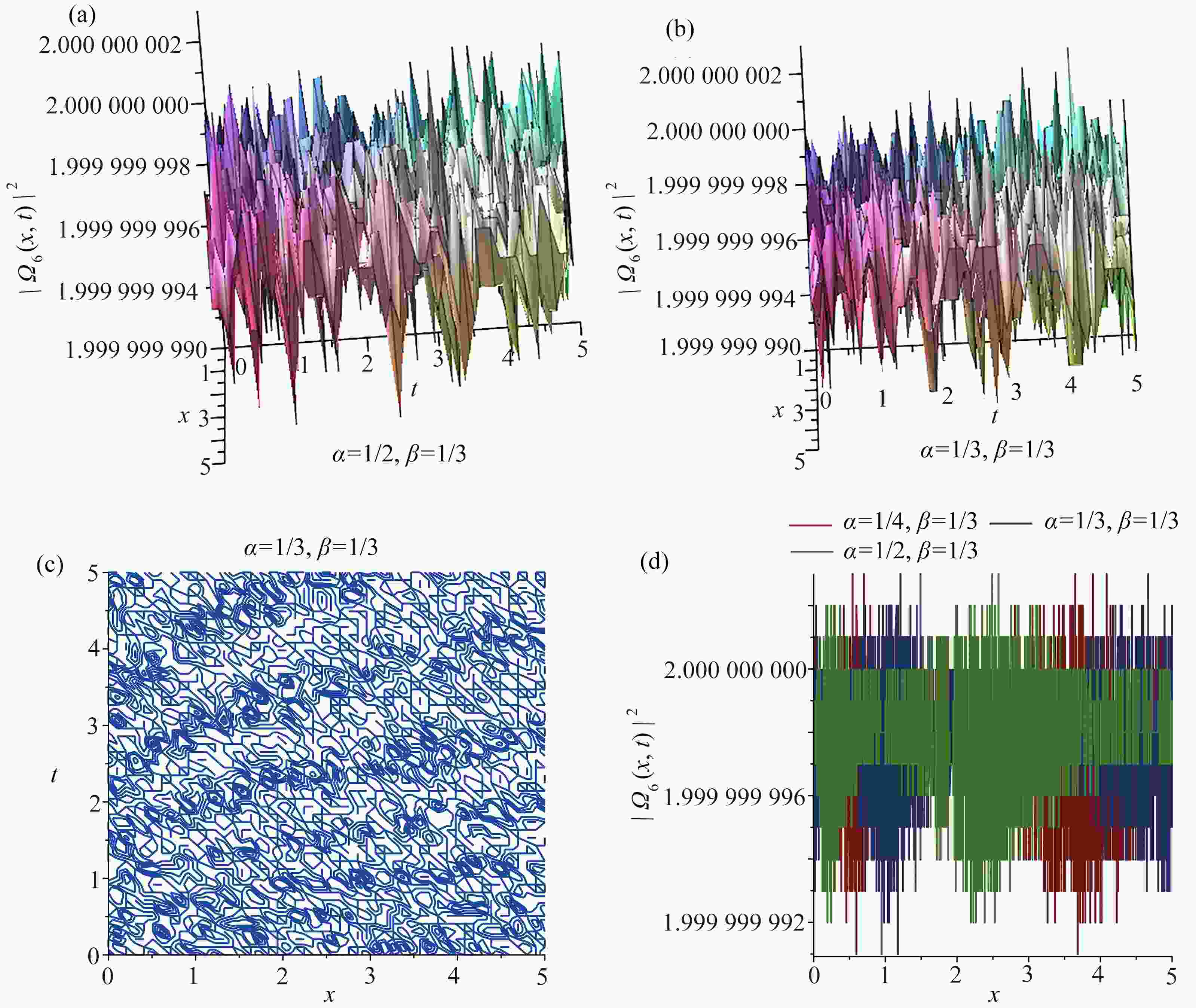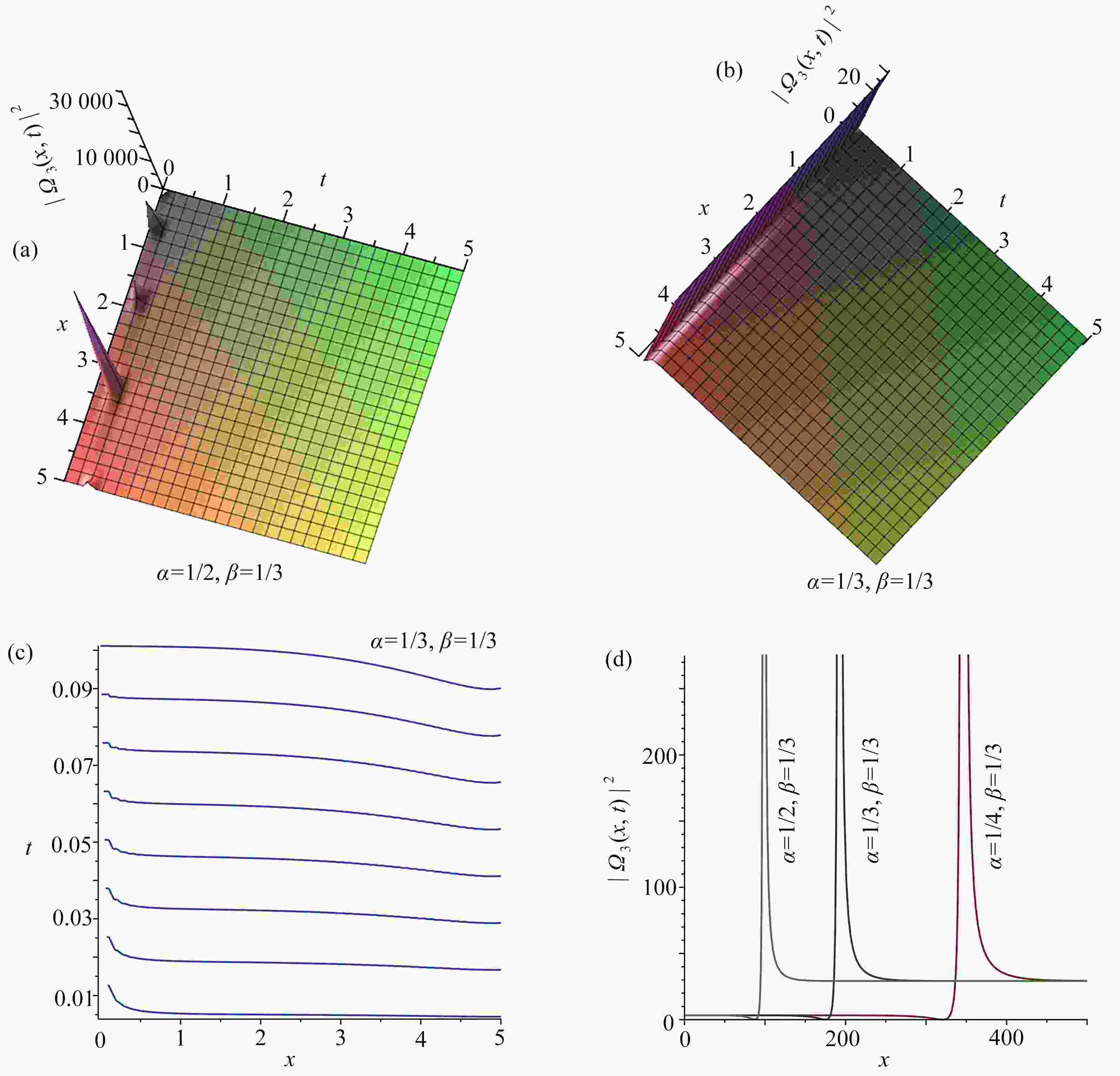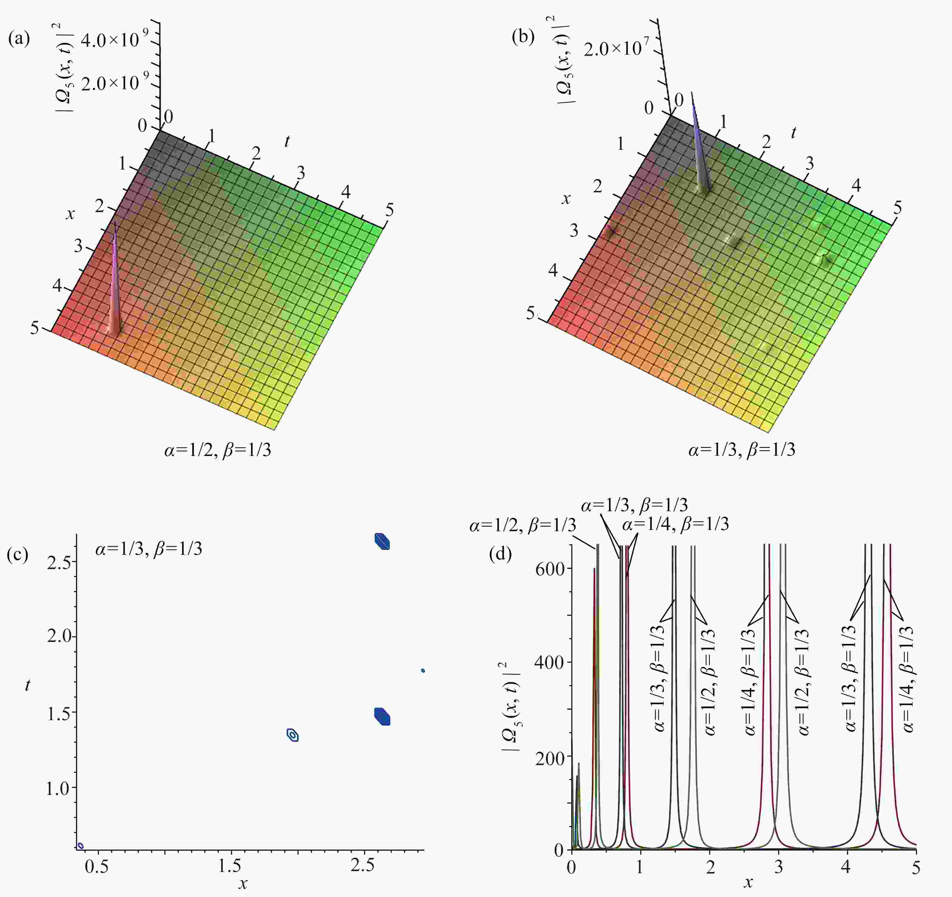 图  5  ${\left| {{\varOmega _5}(x,t)} \right|^2}$取不同分数阶导数值时的三维图,图5(b)对应的等高线图,以及$ t = 3 $${\left| {{\varOmega _5}(x,t)} \right|^2}$关于$ x $的截面图:(a) $\alpha=1/2, \beta=1/3,{\left| {{\varOmega _5}(x,t)} \right|^2}$的三维图; (b) $\alpha=1/3, \beta=1/3,{\left| {{\varOmega _5}(x,t)} \right|^2} $的三维图; (c) 图5(b)的等高线图; (d) 当$ t = 3 $${\left| {{\varOmega _5}(x,t)} \right|^2}$关于$ x $的截面图
