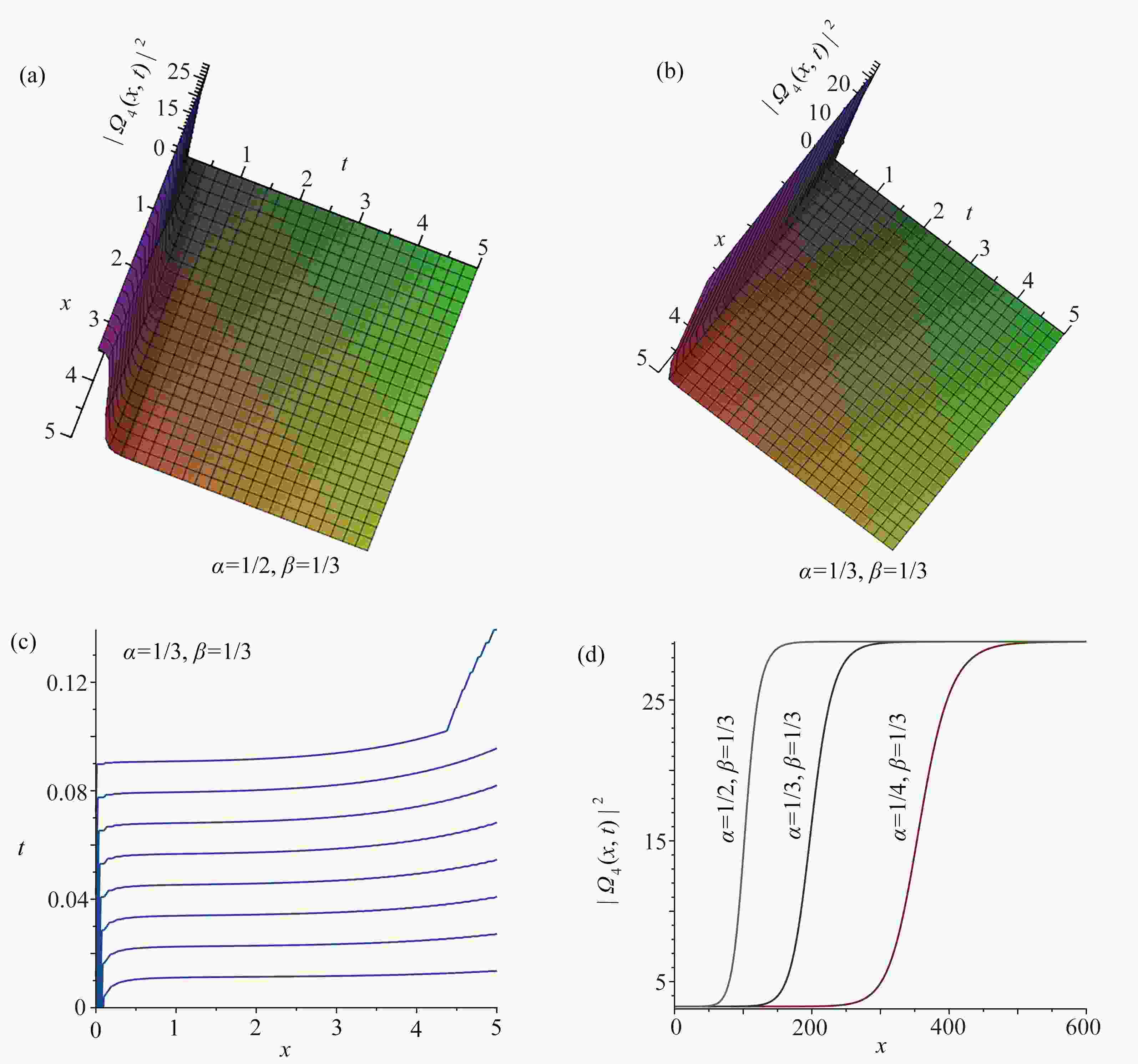 图  4  ${\left| {{\varOmega _4}(x,t)} \right|^2}$取不同分数阶导数值时的三维图,图4(b)对应的等高线图,以及$ t = 3 $${\left| {{\varOmega _4}(x,t)} \right|^2}$关于$ x $的截面图:(a) $\alpha=1/2, \beta=1/3,{\left| {{\varOmega _4}(x,t)} \right|^2}$的三维图; (b) $\alpha=1/3, \beta=1/3,{\left| {{\varOmega _4}(x,t)} \right|^2} $的三维图; (c) 图4(b)的等高线图; (d) 当$ t = 3 $${\left| {{\varOmega _4}(x,t)} \right|^2}$关于$ x $的截面图