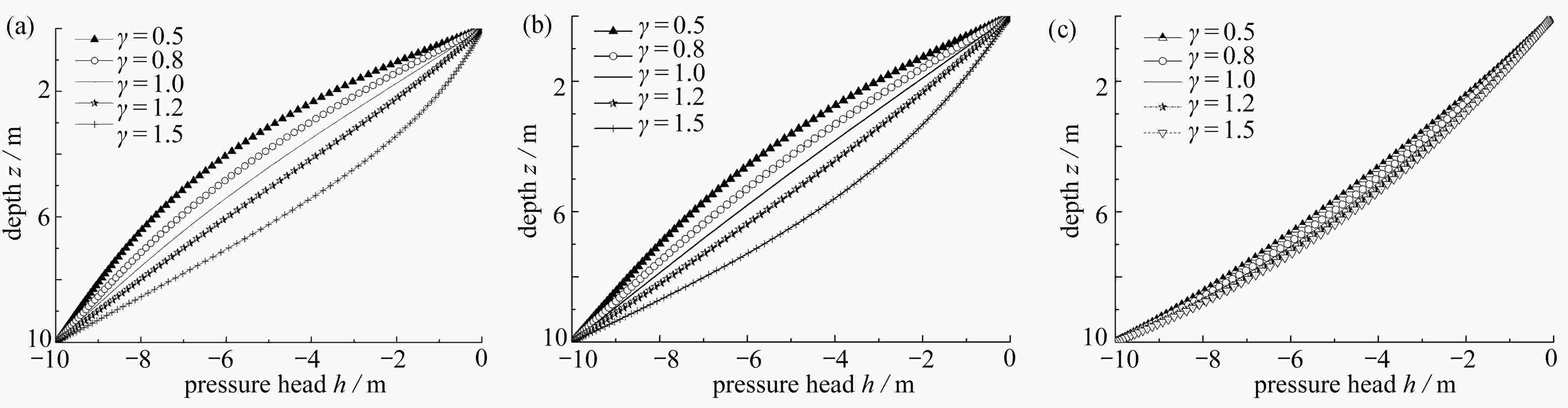 图  3  不同模型和阶次$\gamma $下获得的压力水头曲线: (a) Gardner模型;(b) Fredlund-Xing模型;(c) van Genuchten-Mualem模型