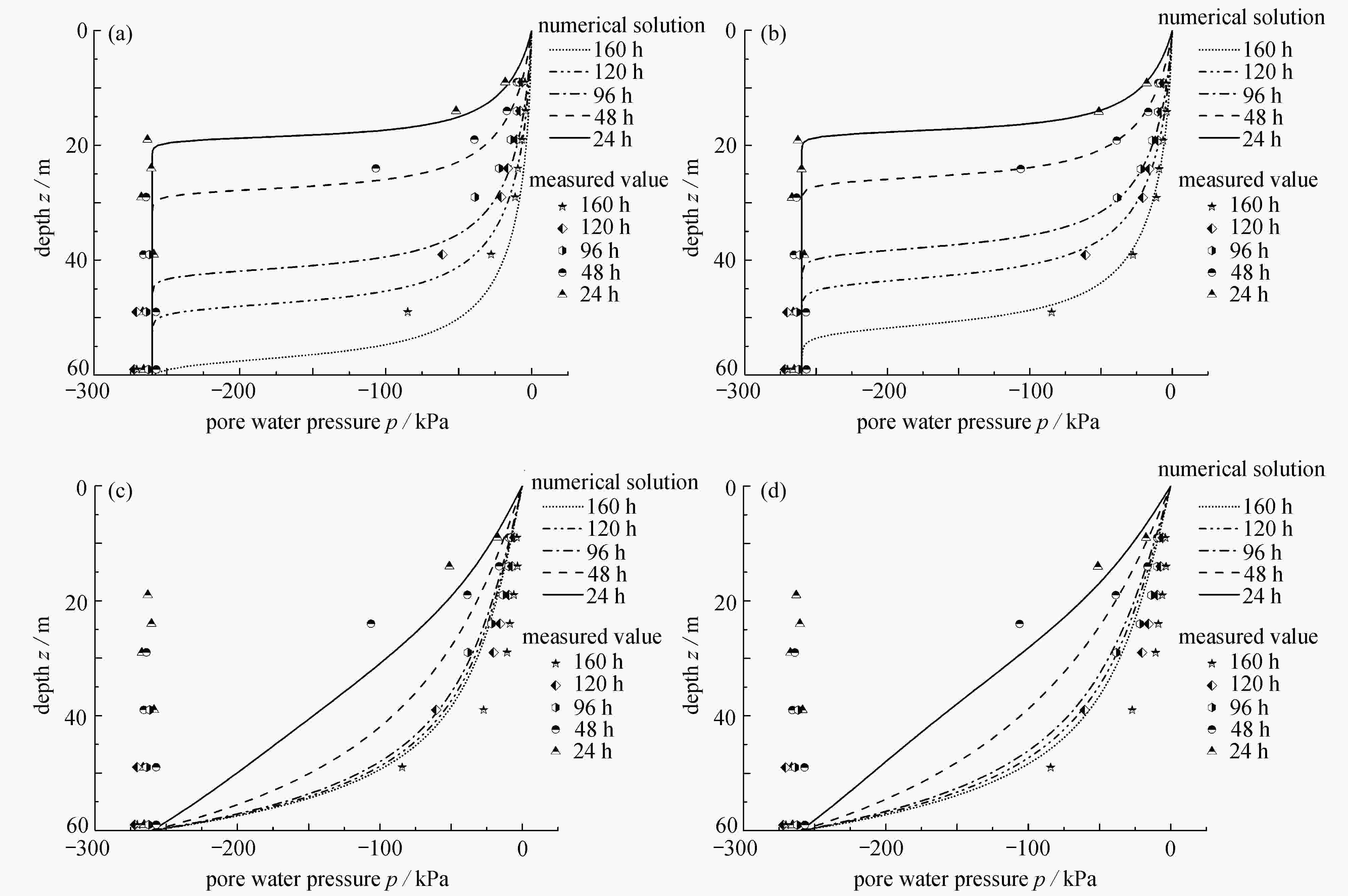 图  7  比较不同SWCC下不同阶次$\gamma $获得的数值解: (a) VGM模型,γ =1;(b) VGM模型,γ = 0.97; (c) FX模型,γ =1;(d) FX模型,γ = 0.97