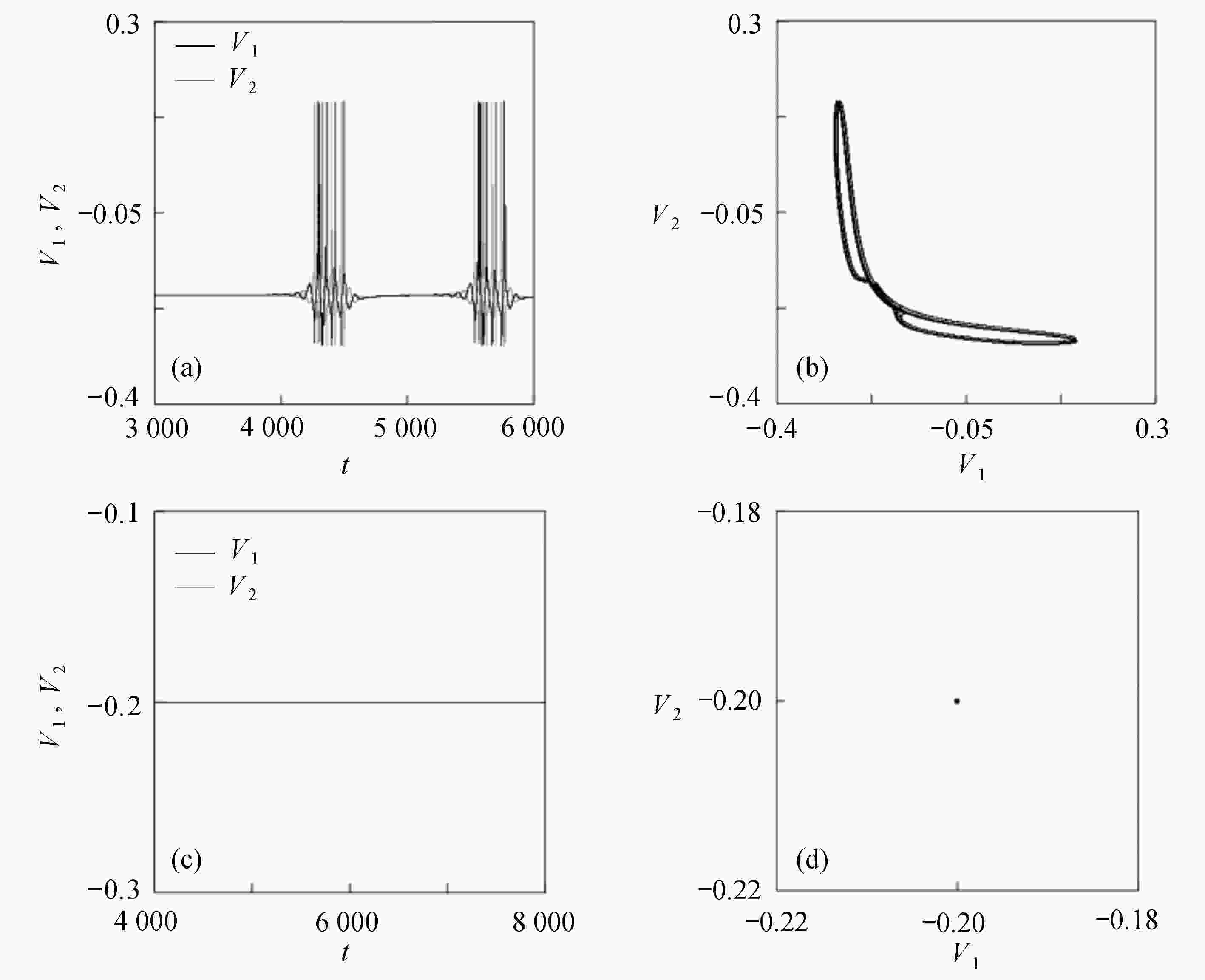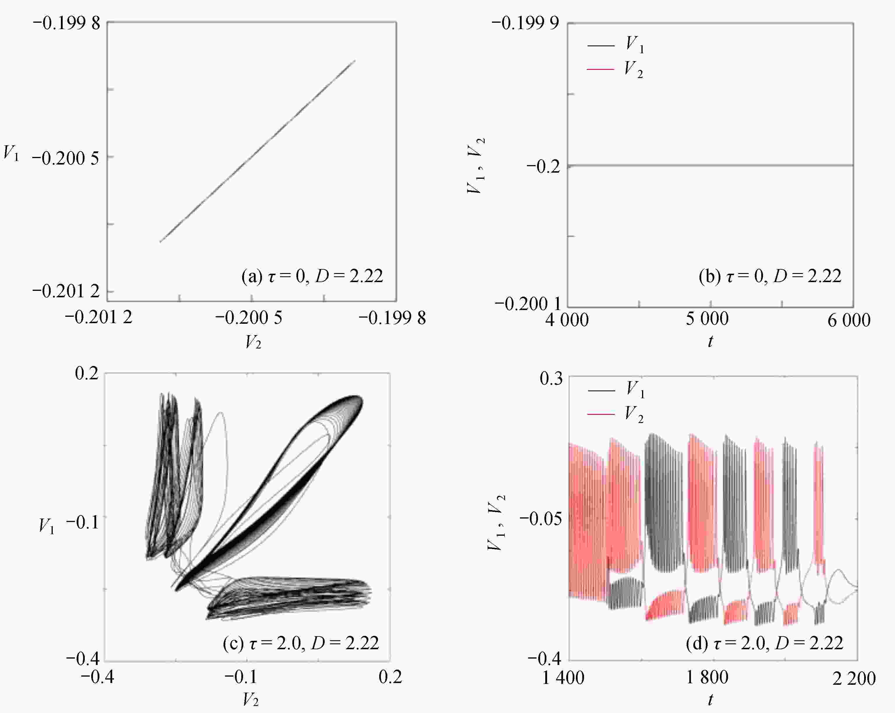 $D = 1.98$ 时的时间历程图;(b)$D = 1.98$ 时的相图;(c)$D = 2.04$ 时的时间历程图;(d)$D = 2.04$ 时的相图Figure 2. Time history diagrams and phase diagrams of system (1) under inhibition: (a) the time history diagram at time