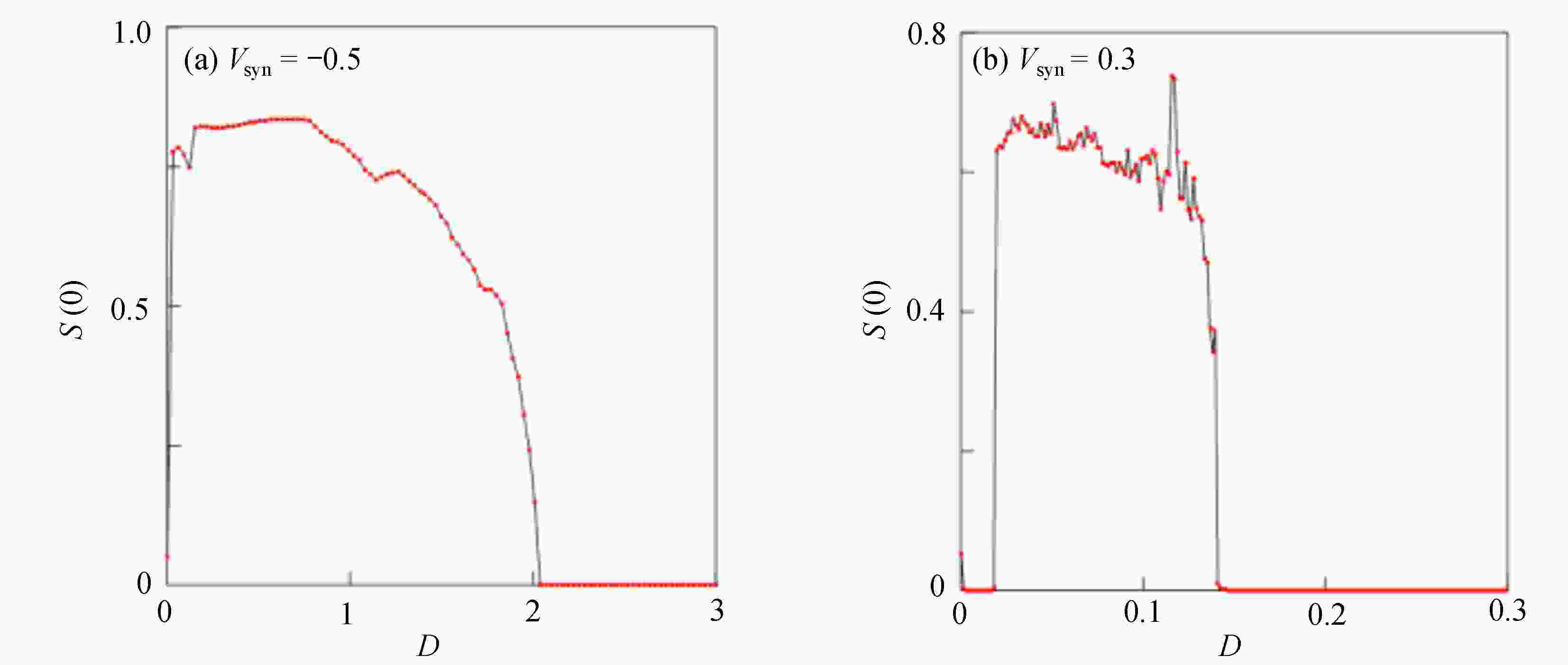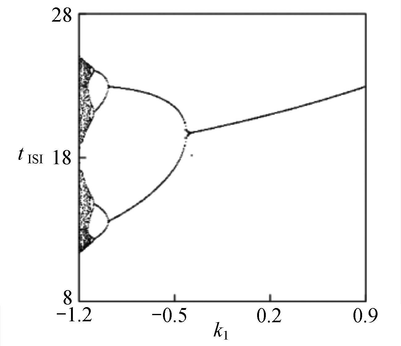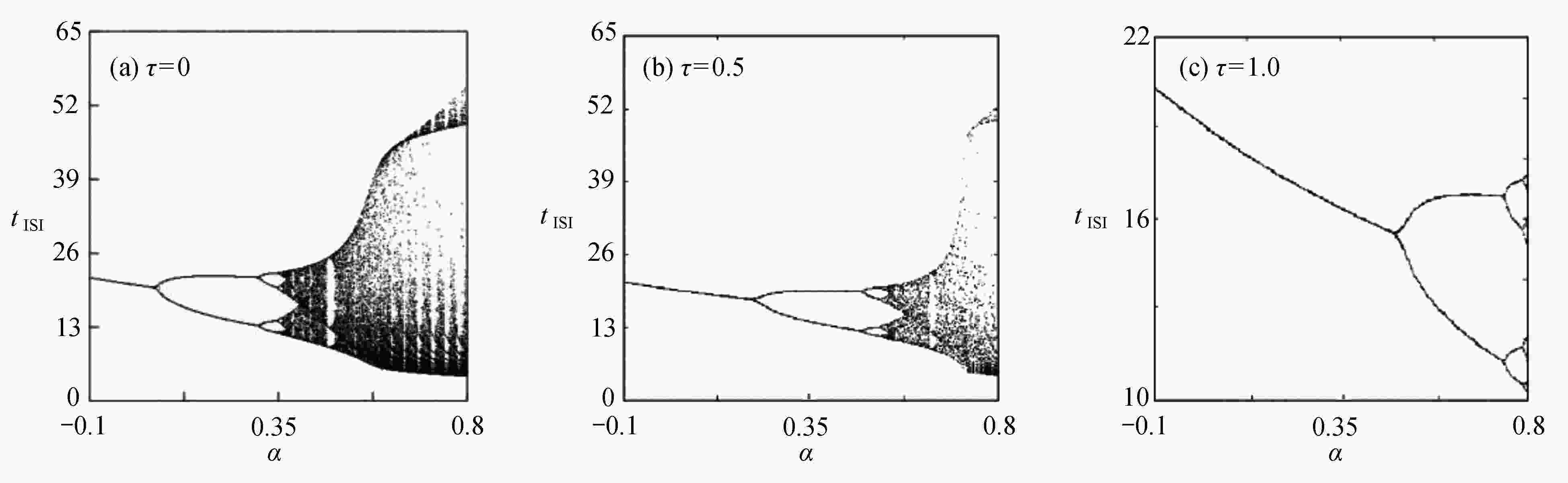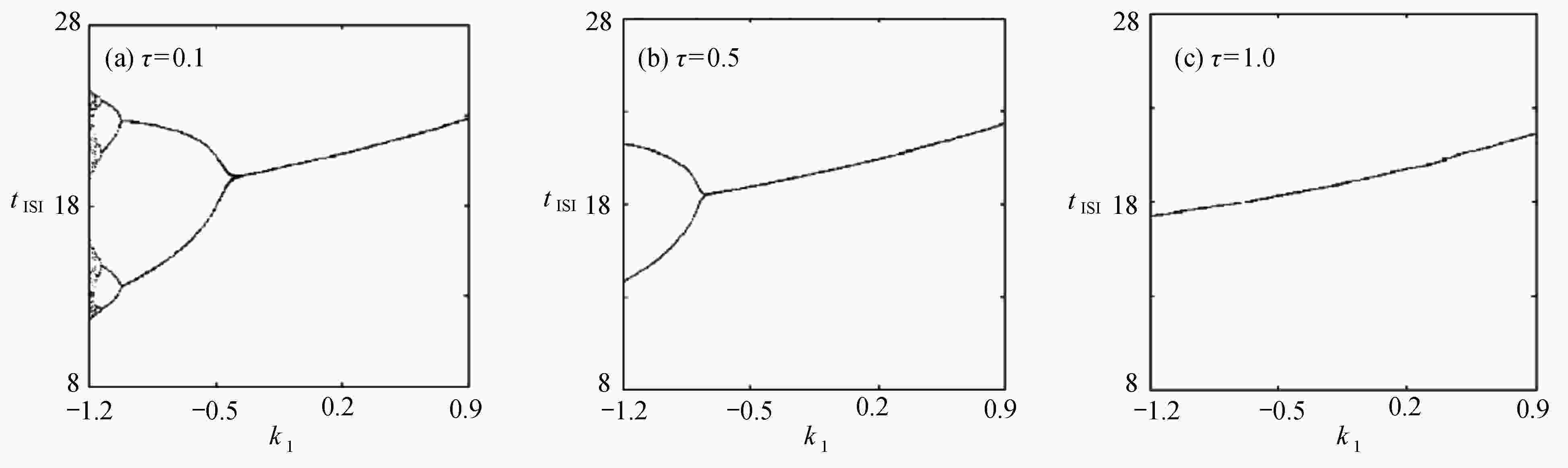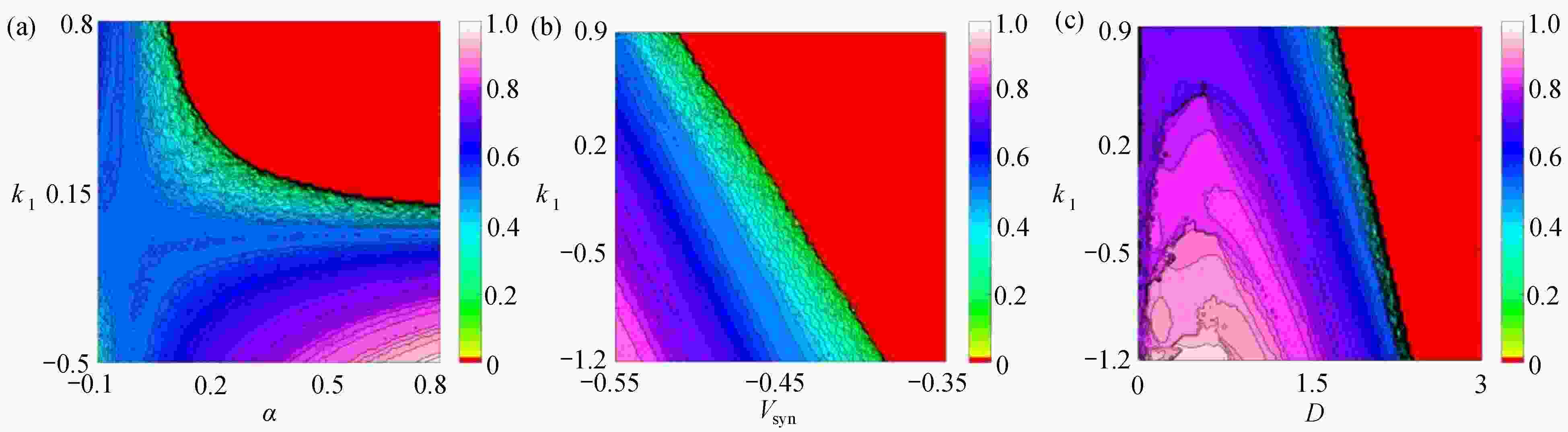 ${k_1}$ 与参数$\alpha $ 相似函数图;(b) 反馈增益${k_1}$ 与参数${V_{{\rm{syn}}}}$ 相似函数图;(c) 反馈增益${k_1}$ 与耦合强度D相似函数图Figure 11. Similar function diagrams of system (2) without delay: (a) the feedback gain