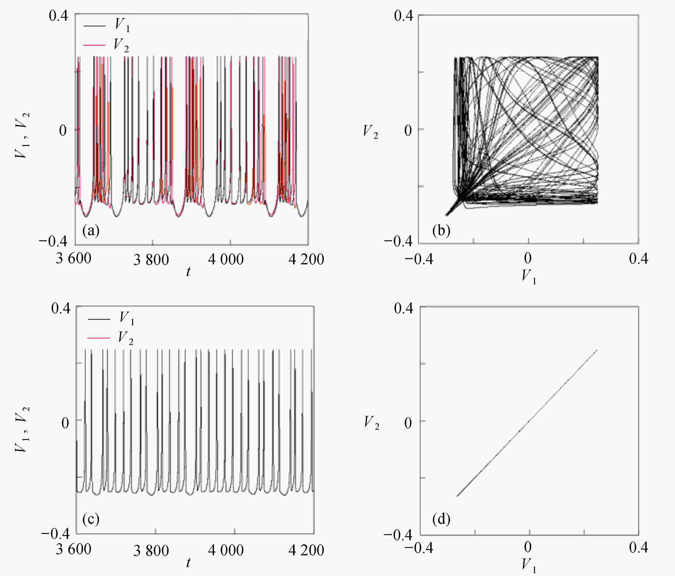 $ {k_1} $ and$ V_{\rm{K}} $ two-parameter bifurcation diagram; (b) the$ {k_1} $ and$ V_{\rm Ca} $ two-parameter bifurcation diagram; (c) the$ {k_2} $ and$ g_{\rm Ca} $ two-parameter bifurcation diagram; (d) the$ {k_2} $ and$ g_{\rm{K}} $ two-parameter bifurcation diagram图 11 系统(2)在无时滞状态下的相似函数图:(a) 反馈增益