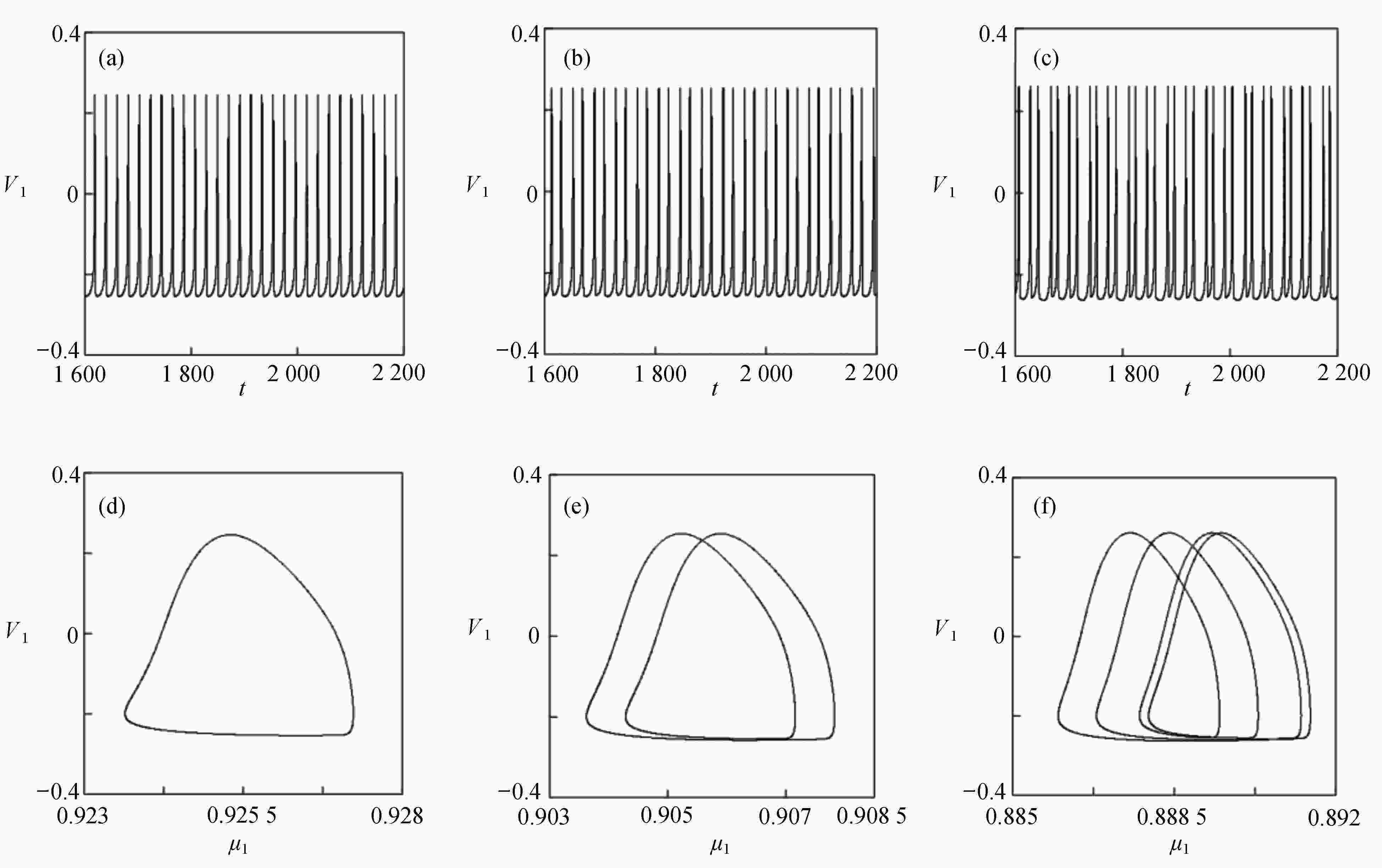 $ {k_1} = 0.2 $ 的时间历程图;(b)$ {k_1} = - 0.5 $ 的时间历程图;(c)$ {k_1} = - 1.08 $ 的时间历程图;(d)$ {k_1} = 0.2 $ 的相图;(e)$ {k_1} = - 0.5 $ 的相图;(f)$ {k_1} = - 1.08 $ 的相图Figure 5. Time history diagrams and phase diagrams of system (2) under different feedback gains: (a) the time history diagram at time