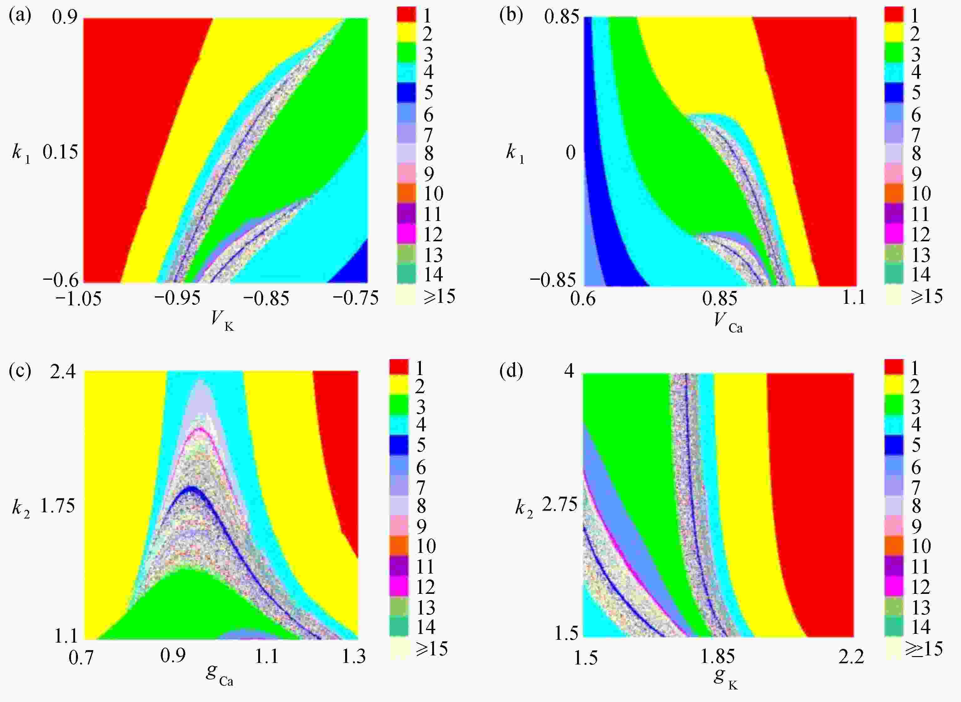 $ {k_1} $ ,$ {k_2} $ 与不同参数的双参数分岔图:(a)$ {k_1} $ 与$V_{\rm{K}}$ 双参数分岔图;(b)$ {k_1} $ 与$ V_{\rm Ca} $ 双参数分岔图;(c)$ {k_2} $ 与$ g_{\rm Ca} $ 双参数分岔图;(d)$ {k_2} $ 与$ g_{\rm{K}} $ 双参数分岔图Figure 8. Two-parameter bifurcation diagrams with feedback gains and different parameters: (a) the