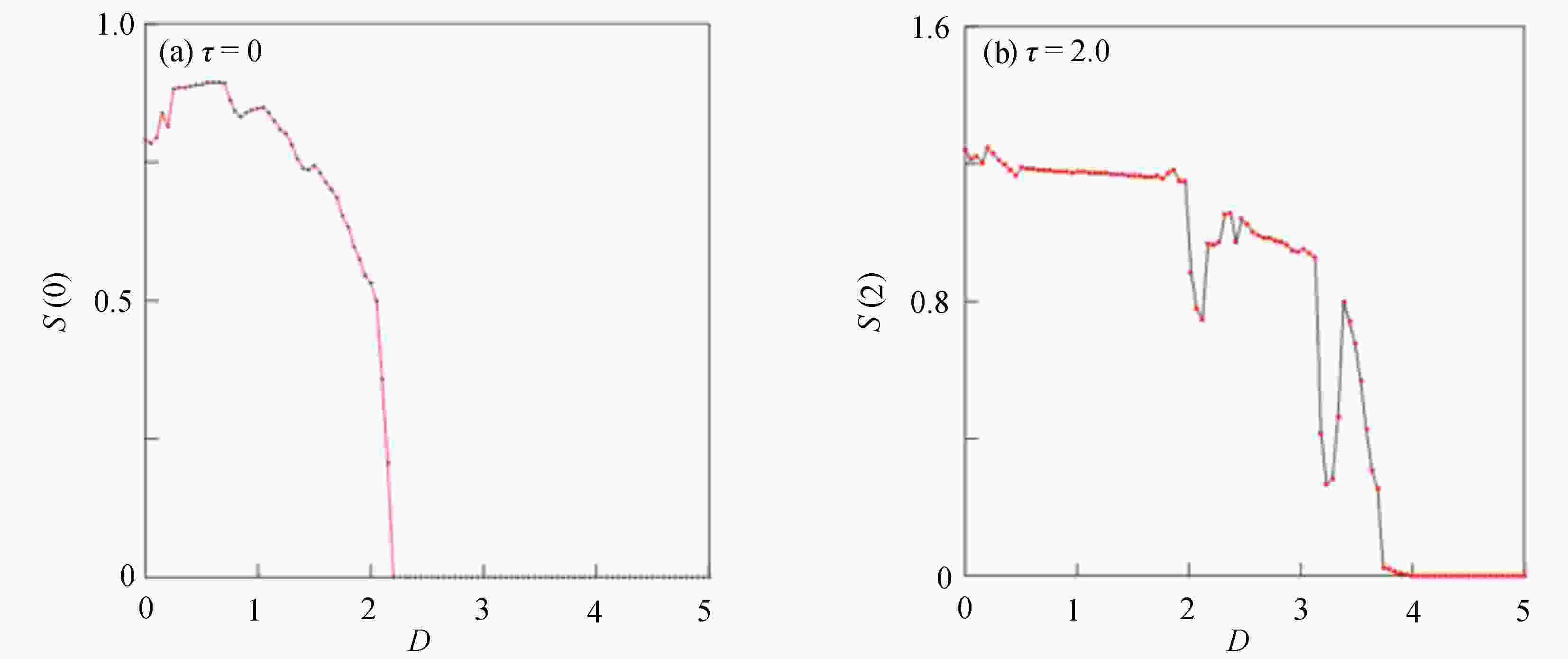 $D = 0.081$ ; (b) the phase diagram at time$D = 0.081$ ; (c) the time history diagram at time$D = 0.175$ ; (d) the phase diagram at time$D = 0.175$ 图 5 系统(2)在不同反馈增益下的时间历程图与相图:(a)