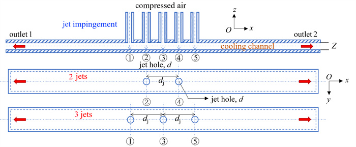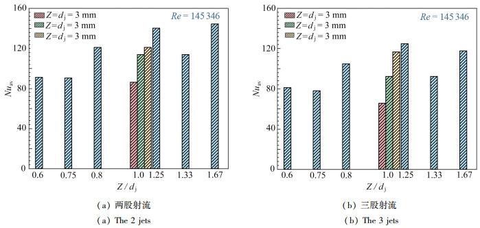 阵列射流是提高微型通道或狭小空间内传热性能的有效方法.借助试验研究和数值仿真方法,从靶面温度分布、流场信息和全局Nusselt数等角度,探究了射流高度/射流间距(Z/dj=0.60~1.67)这一无量纲参数对多股射流冲击流动传热的影响规律.结果表明:当射流孔数目为奇数时,流体之间的相互作用力越发平衡;当总流量不变时,射流孔数目越少,冷却效果越好;当射流间距较小时,射流会出现明显偏移.随着射流间距的增大,流动结构的对称性逐渐恢复,射流之间的相互作用减弱,受热面温度分布和流体速度分布更加均匀.多股射流的流动传热性能受Zdj的共同影响,Z/dj对2个和3个射流孔下Nusselt数分布影响差异性较小,其中Z/dj值分别为1.67和1.25时Nusselt数达到峰值.该文的研究结论有助于优化多股射流结构,进一步提升多股射流的换热性能.