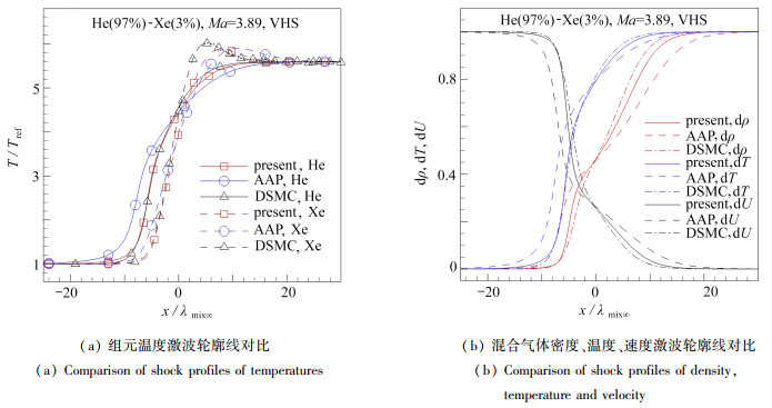 为研究跨流域气体混合物输运现象的流动机理,从气体动理学理论的基本方程Boltzmann方程出发,发展了一种适于混合气体的多松弛碰撞模型方程,并建立了与DSMC方法相适应的碰撞松弛频率表达式.模拟了多组元混合气体一维激波结构问题,与DSMC结果的对比表明:发展的模型方程能较好地反映激波内部混合气体整体及各组元的宏观参数变化过程,能用于模拟和分析混合气体各组元的扩散规律,验证了该多松弛模型方程的有效性和正确性.模拟结果表明:分子质量最小的组元扩散效应最显著,但受其他组元的影响较小,且流动的非平衡效应主要由分子质量最大的组元产生;在激波内部因温度梯度引起的热扩散对分子质量大小更加敏感,同时,组元浓度梯度引起的质量扩散使组元分离,在激波下游产生显著的非平衡效应,且在多组元混合气体中,中等质量分子的加入增大了大质量分子的扩散,加大了分离效应.