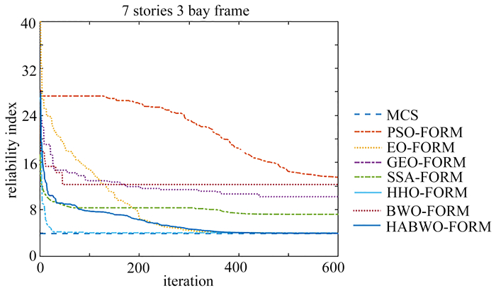 结构可靠性分析是衡量工程结构不确定性的重要手段,其中一阶可靠度方法(FORM)因简单高效而被广泛使用,但依赖于梯度信息,且对高维非线性问题可能陷入不收敛. 该文引入自适应改进白鲸优化算法(hybrid Alibaba-beluga whale optimization, HABWO)进行工程结构可靠性分析,其中白鲸优化算法(beluga whale optimization, BWO)更新策略控制算法开发阶段,结合阿里巴巴与四十大盗优化算法(Alibaba and the forty thieves algorithm, AFT)的智慧等级与更新机制控制算法探索阶段,并发展了自适应策略来平衡算法的探索和开发能力. HABWO结合一阶可靠度方法寻优可靠指标,具有较好的全局寻优和收敛能力. 最后,通过三个工程结构可靠度分析案例进行验证,比较了6种不同的群智能优化算法. 分析结果表明,所提方法比其他智能优化算法具有更高的计算精度和稳定性.