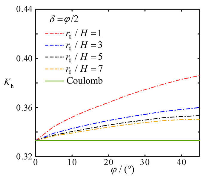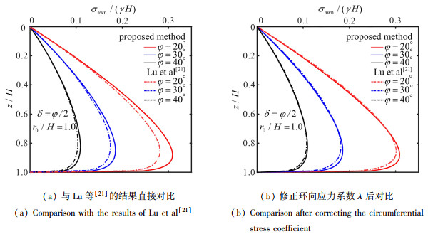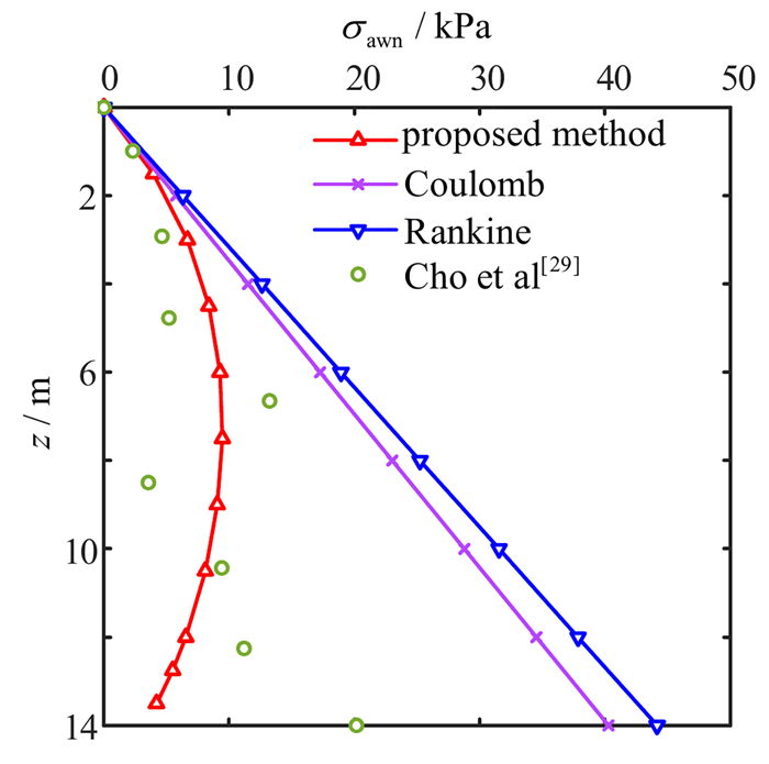 以井壁后填土为无黏性土的圆形竖井为研究对象,假定滑裂面为过墙踵的直线. 考虑环向应力系数沿径向线性变化,基于极限平衡法建立整个滑移土体的静力平衡方程,进而得到圆形竖井主动极限状态下滑裂面倾角的解析式. 在此基础上,考虑空间拱效应和层间剪力的影响,基于水平层分析法推导得到了圆形竖井主动土压力的理论解,进一步分析了竖井主动土压力强度的影响因素,并与现有的理论和试验结果进行了对比分析. 结果显示:土体层间剪力会影响主动土压力强度沿深度方向的分布,且径高比、墙-土摩擦角越大,层间剪力的影响越明显,考虑层间剪力得到的土压力计算值可为竖井结构优化设计提供理论参考. 该文的结果能够很好地描述土压力沿深度先增大后减小的变化趋势,且与模型试验和数值模拟结果吻合较好.