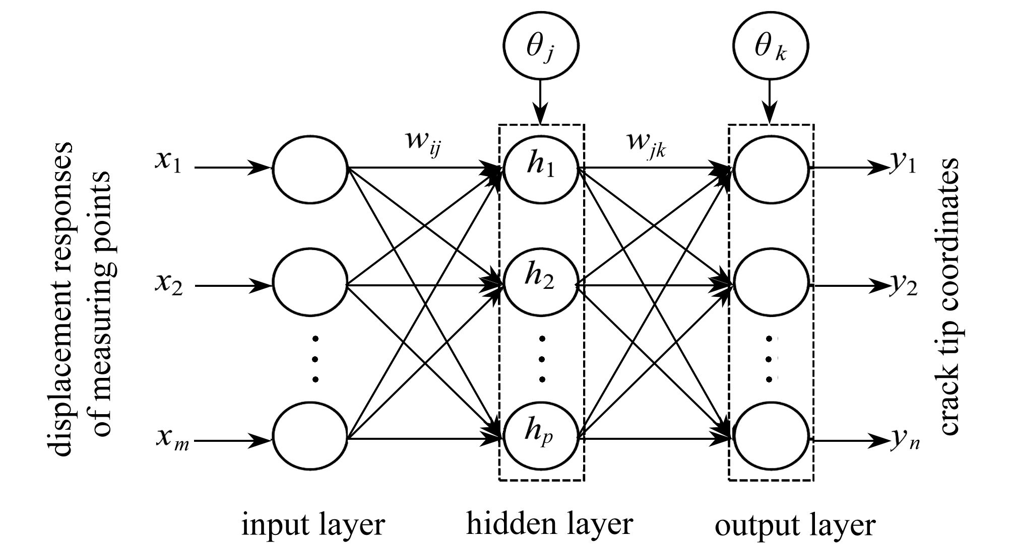 Based on the extended finite element method (XFEM) and the error back propagation (BP) multilayer feedforward neural network algorithm optimized by the genetic algorithm (GA), an inverse analysis model for identifying cracks in structures was established. The GA-BP neural network was trained by the displacement data of measuring points obtained by the XFEM forward analysis, and the network was used for crack inverse identification. The feasibility and accuracy of the model were verified with 2 typical examples, and the effects of the mesh density, the measuring point layout and the input data noise on the accuracy of network recognition were discussed. The results show that, the proposed method can invert the geometric information of straight cracks, which is the major focus of linear elastic fracture mechanics, and has good noise tolerance. Besides, the GA-BP neural network has higher accuracy than the traditional BP neural network in general.