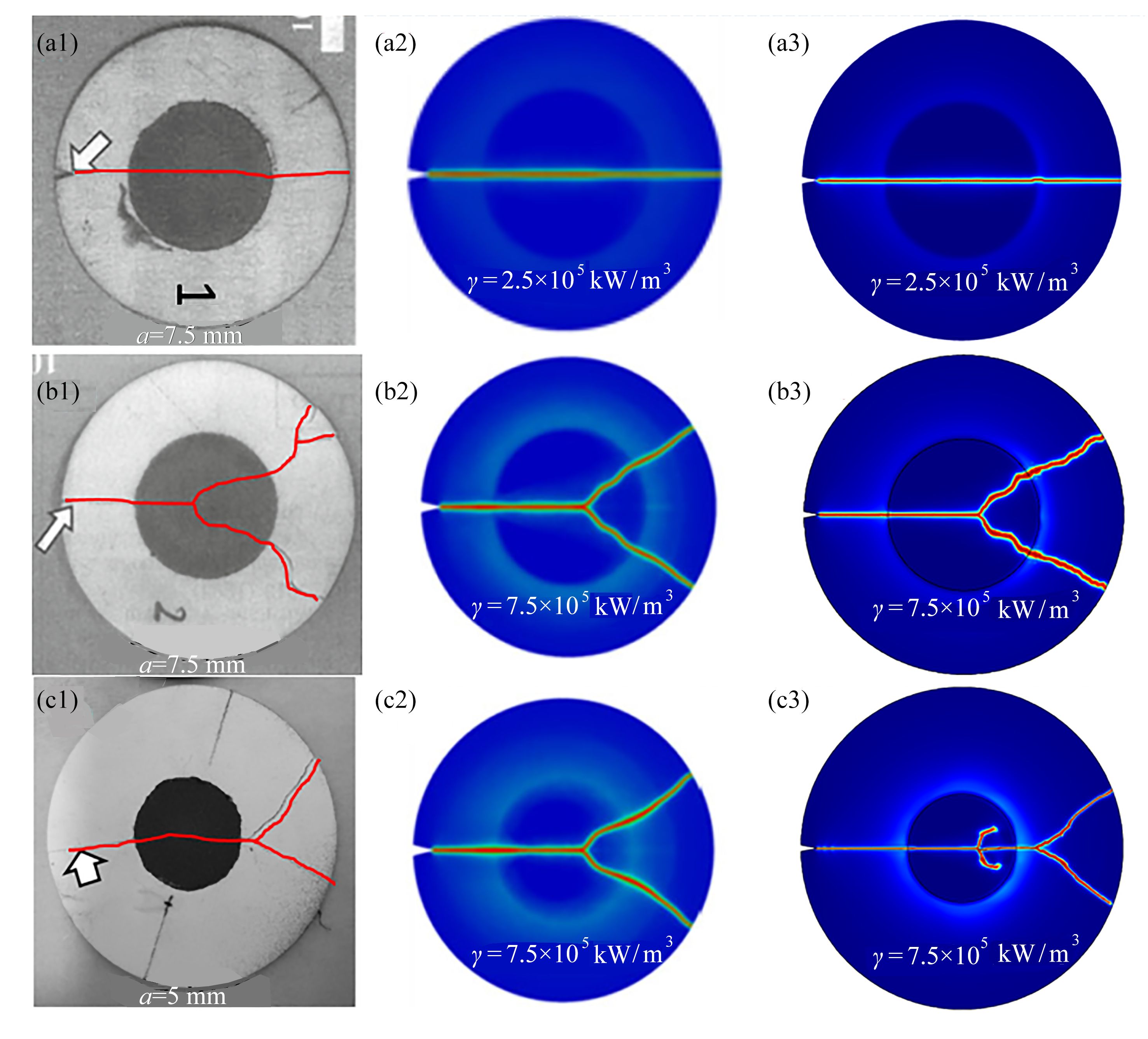 The mechanical properties of alumina ceramic materials are significantly affected by temperature, so it is necessary to consider the temperature dependence of the damage criteria during the simulation of thermal shock crack propagation with the phase-field method. Based on the existing thermodynamic phase-field model, the governing equations for the phase-field model were modified through introduction of the temperature-dependent damage criterion. Then the revised phase-field model was used to simulate the thermal shock experiment of alumina ceramics, and the simulation results were compared with the experimental results and the finite element simulation results without temperature-dependent damage criteria. The results show that, introduction of the temperature-dependent damage criterion helps more reasonably simulate the initiation and propagation process of thermal shock crack.