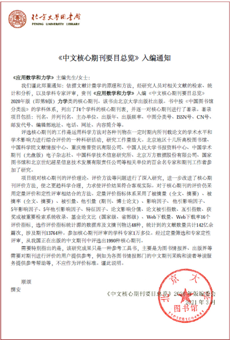 近日,接到《中文核心期刊要目总览》2020年版编委会通知,依据文献计量学的原理和方法,经研究人员对相关文献的检索、统计和分析,以及学科专家评审,贵刊《应用数学和力学》入编《中文核心期刊要目总览》2020年版(即第9版)力学类的核心期刊。该书由北京大学出版社出版。书中按《中国图书馆分类法》的学科体系,列出了74个学科的核心期刊表,并逐一对核心期刊进行了著录。著录项目包括:刊名、并列刊名、主办单位、出版年、出版频率、中图分类号、ISSN号、CN号、邮发代号、编辑部地址、电话、网址、内容简介等。