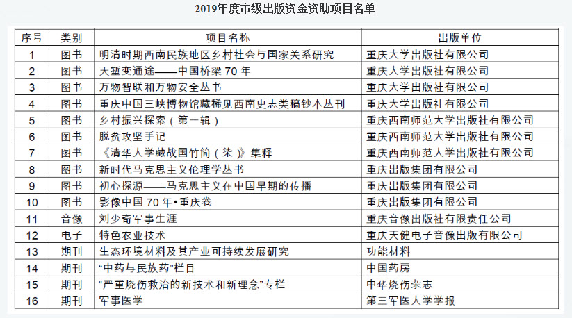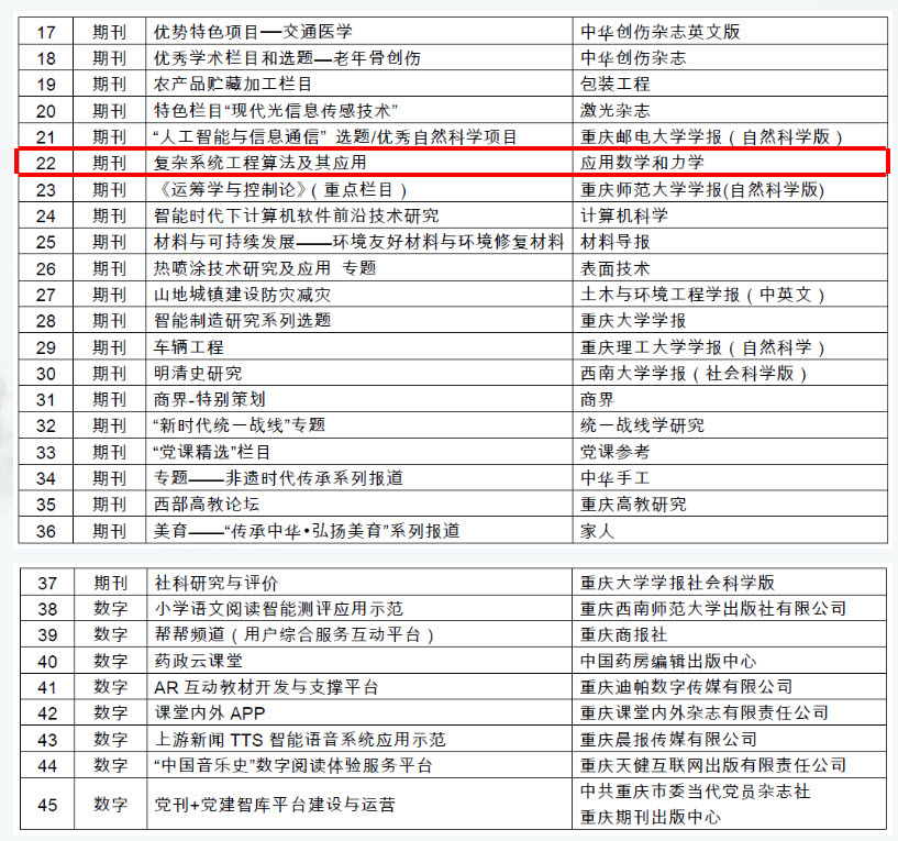 根据重庆报刊网报道,经重庆市出版专项资金资助项目评审专家组评审,2019年度重庆出版专项基金资助项目已经产生,共45项,我刊的《复杂系统工程算法及其应用》专刊入选。具体项目名单详见以下附表: